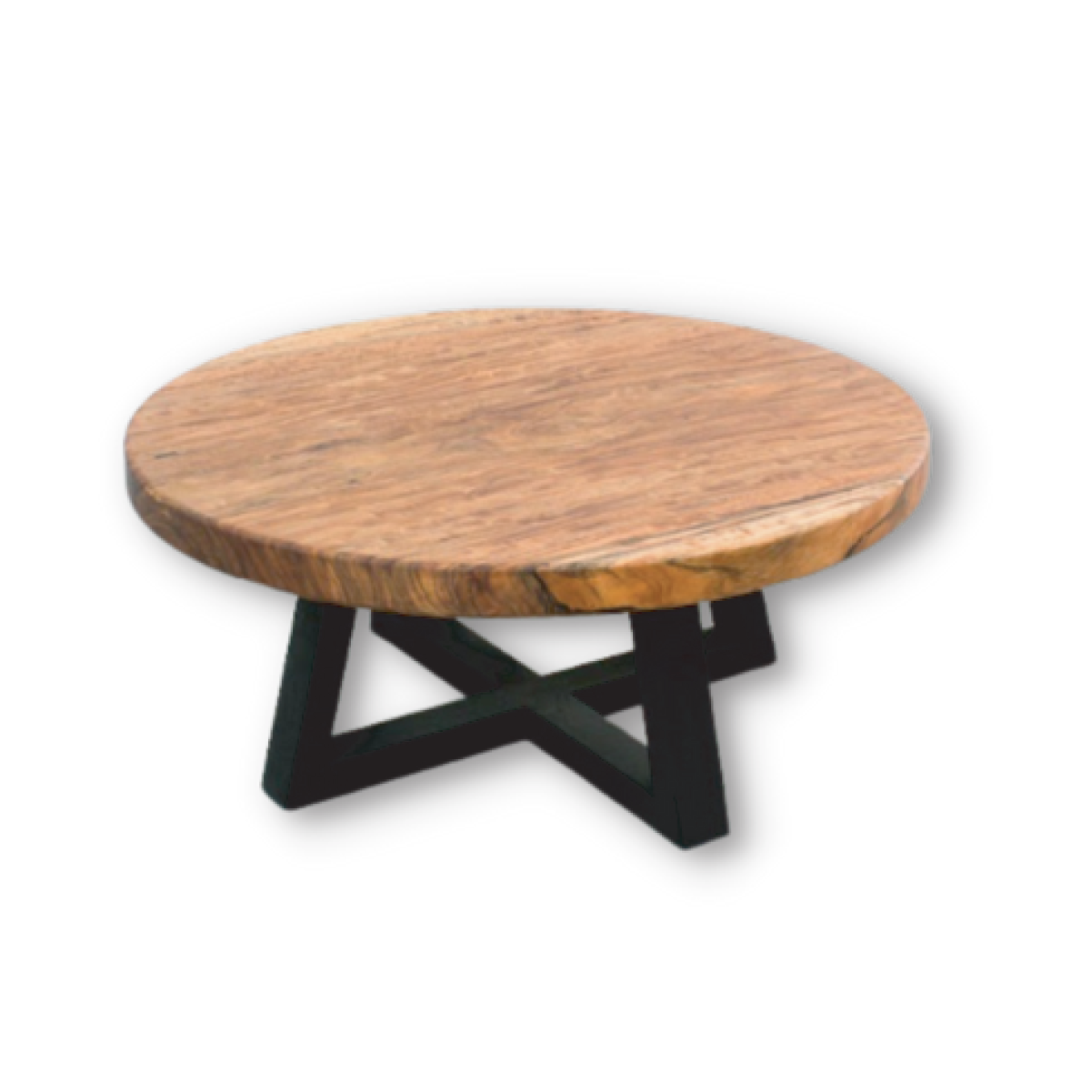 Round Coffee Table (Single Slab): Single-slab dau wood with metal base, natural finish, brings organic charm to any modern living space.